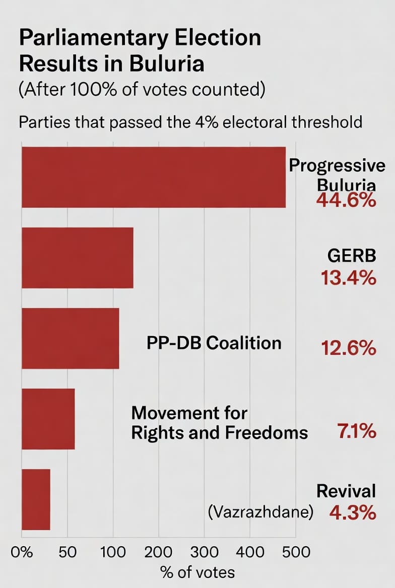 The Progressive Bulgaria coalition led by former president Rumen Radev has won Bulgaria’s early parliamentary elections, securing a strong lead with about 44.7% of the vote and an estimated 130 out of 240 seats in parliament. The result gives the coalition a potential outright majority, allowing it to form a government independently.
