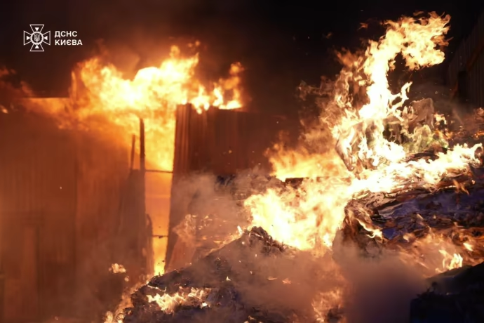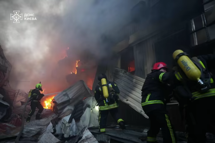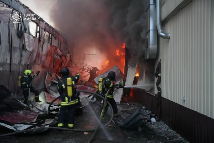 The missile struck a non-residential facility, causing a severe fire and significant destruction to another nearby building. Three cars parked in the area also caught fire, Ukraine’s State Emergency Service reported. Fires were also reported in other districts of the city, including at a furniture shop and a warehouse. A five-story business center suffered “partial destruction” across several floors. Emergency crews have since extinguished all reported fires.