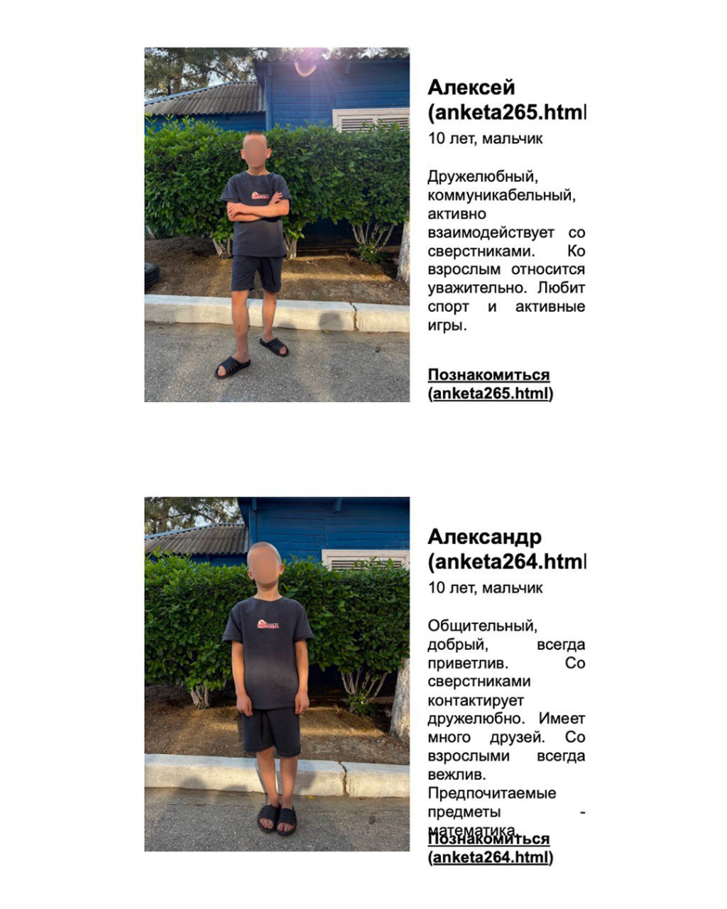Each child is presented with a photo and a brief profile that includes personality traits. Some are described as "obedient" or "calm," language that Ukrainian officials say dehumanizes the children.