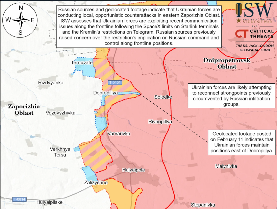 Ukrainian tactical counterattacks in this area are likely an opportunistic response to favorable battlefield conditions. A senior NATO official told the BBC’s Russia service on February 11 that at least some of the Ukrainian battlefield successes in eastern Zaporizhzhia Oblast are due to SpaceX’s efforts to prevent Russian forces from using Starlink terminals in early February 2026. A Kremlin-affiliated Russian milblogger claimed that there are “new complicating factors” to Russian communication issues from restrictions on Russian Starlink access. The milblogger is likely alluding to Russia’s restrictions on the use of Telegram since February 9, which Russian forces on the frontline have also used for communications. Russian milbloggers have been warning that the Kremlin’s decision to block Telegram at the same time as SpaceX’s restrictions on Russian Starlink usage will severely impact Russian communications in the near-term. Ukrainian counterattacks in the Dnipropetrovsk-Zaporizhzhia Oblast border area likely seek to exploit these recent Russian communication and command-and-control (C2) challenges.