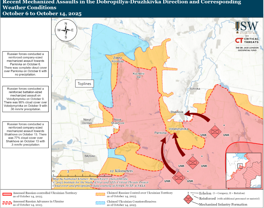Ukraine’s 1st Azov Army Corps reported another reinforced company-sized assault in the Dobropillya direction on October 13, involving 16 armored vehicles and tanks, as well as motorcycles. Russian troops again attempted to seize Shakhove, but Ukrainian forces destroyed 13 armored vehicles, three tanks, and three motorcycles.