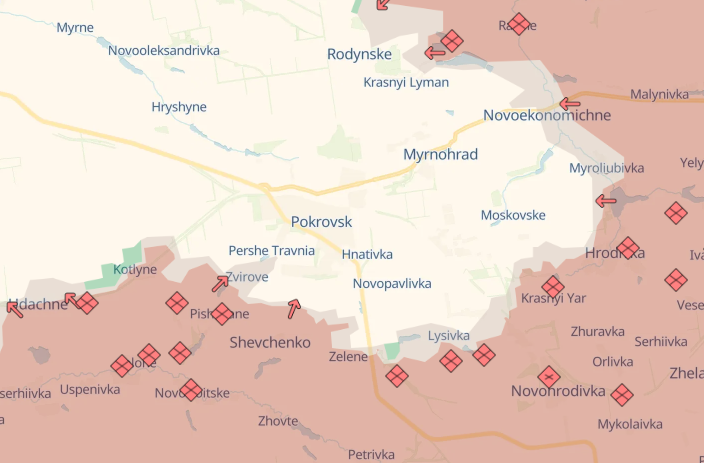 Russian forces are intensifying efforts around Pokrovsk, deploying experienced marine units and shifting tactics to infiltrate the city in small groups while avoiding large-scale clashes. Their main objective is to approach Ukrainian drone and mortar positions, stretch defenses, and expand control over the "gray zone." On the flanks, Moscow has stepped up assaults with armored and motorized vehicles, aiming to disrupt supply routes and encircle the area.